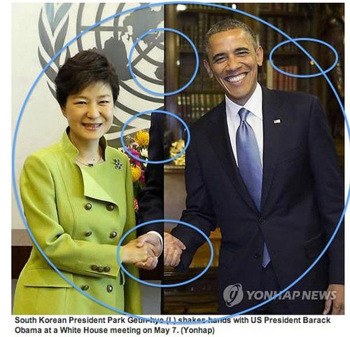 美媒調(diào)侃韓聯(lián)社合成樸槿惠(左)與奧巴馬握手照。(網(wǎng)頁截圖)