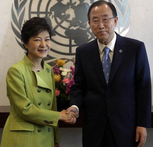 韓國總統(tǒng)樸槿惠與聯(lián)合國秘書長潘基文握手照(資料圖)