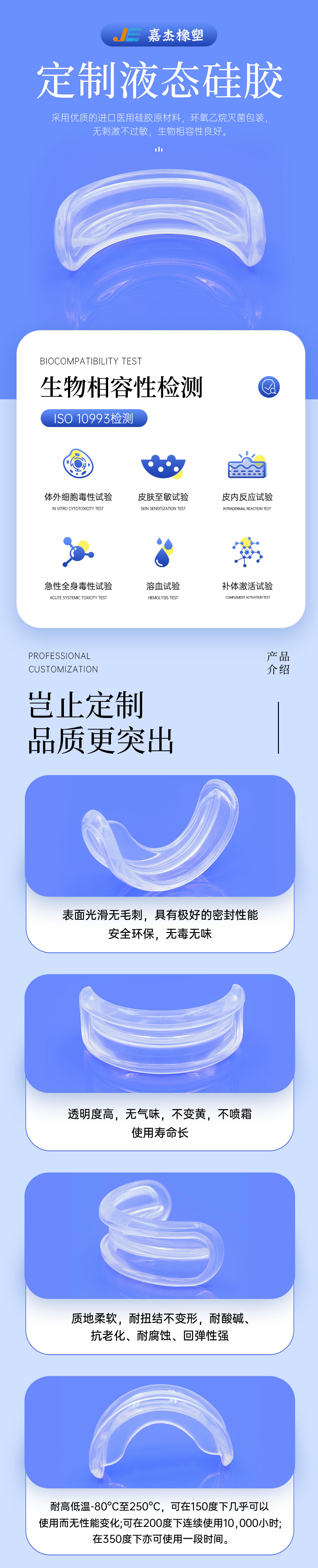 定制液態硅膠: 采用優質醫療級硅膠原料制作,具有良好的物理特性,無毒無味且沒有過敏反應,柔軟高透明可高溫消毒 定制液態硅膠性能: